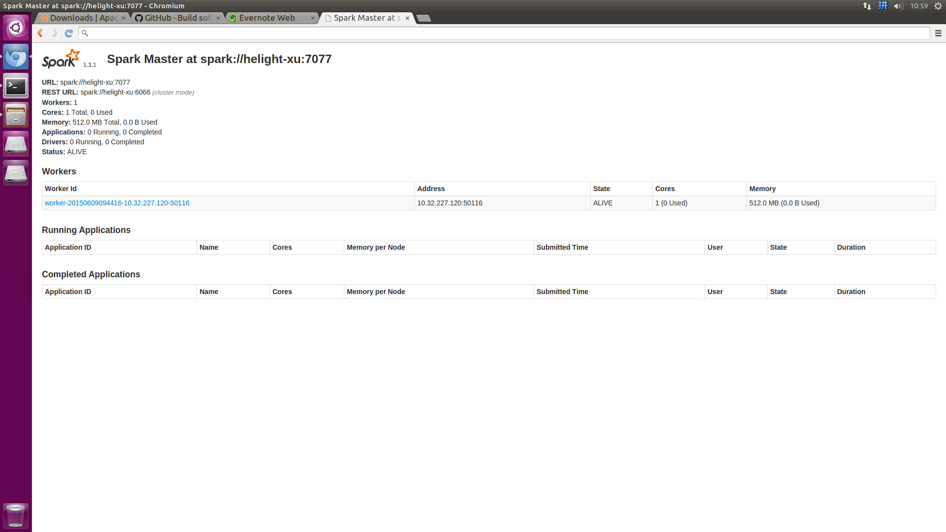 helight 2410 0.7 3.6 4064160 292772 pts/0 Sl 09:44 0:34 /usr/lib/jvm/java-8-openjdk-amd64//bin/java -cp /data/spark/spark-1.3.1-bin-hadoop2.6/sbin/../conf:/data/spark/spark-1.3.1-bin-hadoop2.6/lib/spark-assembly-1.3.1-hadoop2.6.0.jar:/data/spark/spark-1.3.1-bin-hadoop2.6/lib/datanucleus-core-3.2.10.jar:/data/spark/spark-1.3.1-bin-hadoop2.6/lib/datanucleus-api-jdo-3.2.6.jar:/data/spark/spark-1.3.1-bin-hadoop2.6/lib/datanucleus-rdbms-3.2.9.jar -Dspark.akka.logLifecycleEvents=true -Xms512m -Xmx512m org.apache.spark.deploy.master.Master --ip helight-xu --port 7077 --webui-port 8080